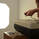 Retro styled footage of a woman operating a slide projector with a wired remote control. Focus is set on the womans hand.