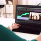technology, post production and vlog concept – woman working on video of summer vacation in editor program on laptop computer at home office