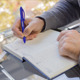 A man writes in a diary.