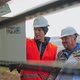 Electrical engineer holding project while analyzing electricity box at solar power plant