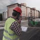 Working process. Contractor in working uniform control according to plan. Builder phone call and walking along construction site of new residential area. Foremant supervising construction.