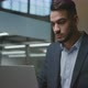 Working process. Young middle eastern man manager typing on laptop, making online plan and financial report, sitting alone at office, tracking shot, slow motion
