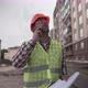 Working process. Contractor in working uniform control according to plan. Builder phone call and walking along construction site of new residential area. Foremant supervising construction.