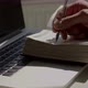 Working process. Recording thoughts and ideas in a notebook. Man hand in suit makes notes with pen in a paper diary at laptop, closeup. Skill of writing by hands, penmanship.