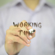Man, Businessman, entrepreneur, stock trader, analyst or banker writes on transparent wall : Working Time