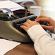 Female writer typing on an old typewriter on the desk with a nice cup of coffee and books.