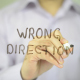 Man, Businessman, entrepreneur, stock trader, analyst or banker writes on transparent wall : Wrong Direction