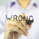 Young Man, Businessman, entrepreneur, creative designer, freelancer writes and draws on transparent wall : Wrong