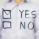 Man marks tick ( selecting ) sign on box of yes on transparent surface ( glass )