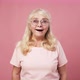 Yes. Happy elderly woman in glasses looking to camera and enjoying success, celebrating with win gesture, pink studio background, fast motion