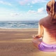 A beautiful young woman is sitting in a Lotus position on the sand. Yoga classes on the beach by the ocean early in the morning. The concept of calmness and meditation. Harmony and balance..