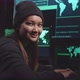 Young Asian Woman Hacker Using Computer Hacking, Looking And Warmly Smiles To Camera, Code On Multiple Computer Screens