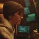 Young man in hat and glasses talking with associate and using computers to hack data base while sitting at desk on dim criminal base Full HD version