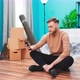 Young man are using phone amid boxes in a new house. Young couple at home web surfing on internet. Teenager shopping online over cell phone . Online order. Shopping and payment online