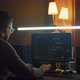 Young man mobile developer writes program code on a computer, programmer work in home office. High quality 4k footage