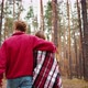 Young loving pair in casual clothes, smiling and hugging while walking by path in autumn pine forest. Trees with yellow foliage. Happy hikers, tourism, weekend. Back view, tracking shot, slow motion