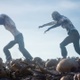 Zombies walk and crawl forward on human bones through smoke and fog. The concept of the zombie-apocalypse. Looping animation for fantasy, fiction, zombie and apocalypse backgrounds.